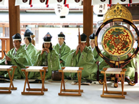 下拝殿(しもはいでん)にて伶人が雅楽を演奏する中、色とりどりの神饌や玉串を御神前に供え、厳粛に祭典が斎行されます。どなたでも見学できます。