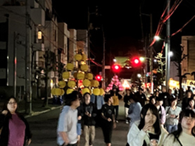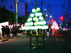 暗くなると竿頭(かんとう)に光が灯り、夜遅くまで八幡通りは賑わいます。