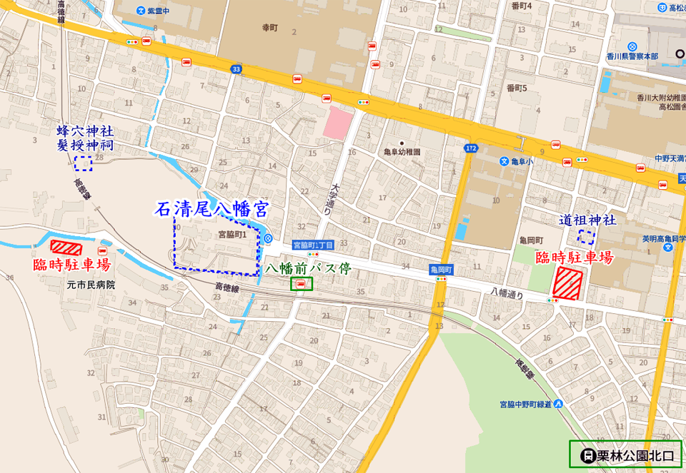 代わりに亀岡公園横の御旅所や、亀岡小学校グラウンドの一部、1月1日の朝からは元市民病院駐車場が臨時駐車場になりますので、警備員の誘導に従ってご利用ください。