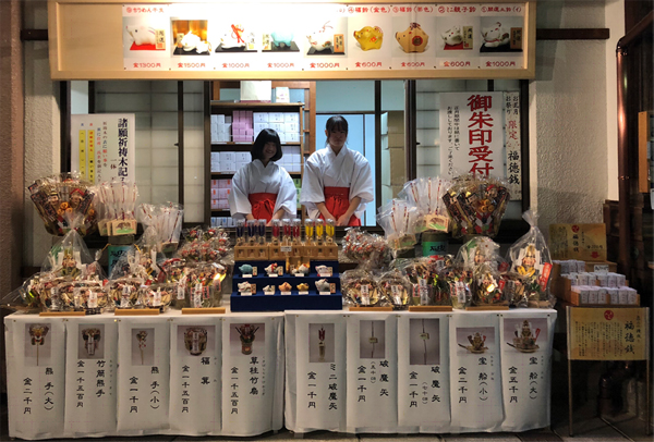 授与所では新年のお札・お守りの他、破魔矢や熊手・干支土鈴など縁起物も多数用意しています。