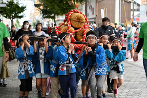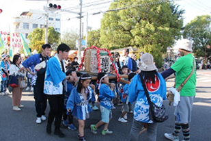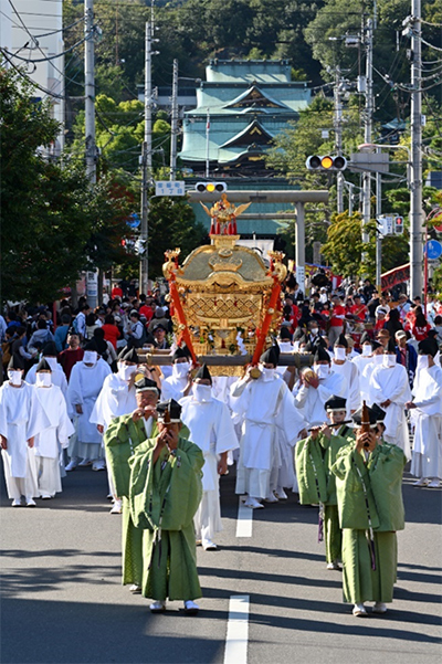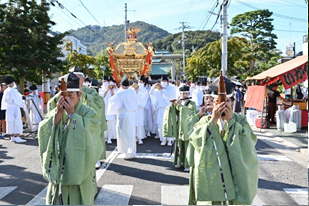 神様にご奉仕する御先良(おしゃきら)さんも御神輿に先立って御旅所(おたびしょ)に向かいます。「奴(やっこ)」や「獅子舞」、「ちょうさ」や「子ども神輿」も行列を彩り、盛り上げます。