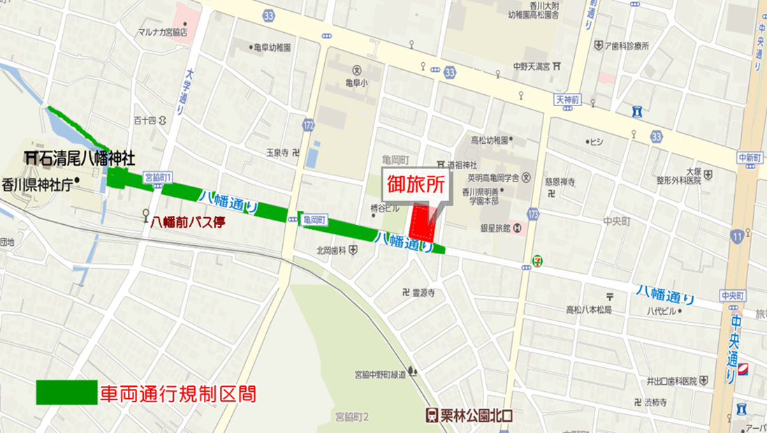 2日間 八幡通り(下地図の緑の部分)は歩行者天国になり、屋台・縁日が軒を並べ、たいへん賑わいます。