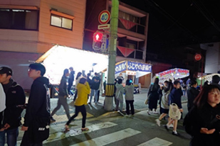 八幡通りは両日とも屋台が軒を連ね、遅くまで賑わいます。